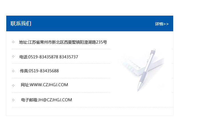 地址:常州市新北區友邦商務大廈1幢16、17層  電話:0519-85101652  傳真:0519-85112595  郵編:213022  網址:www_cz-jiayue_cn.wsgongyi.com  郵箱:xiajifengaa@163.com
